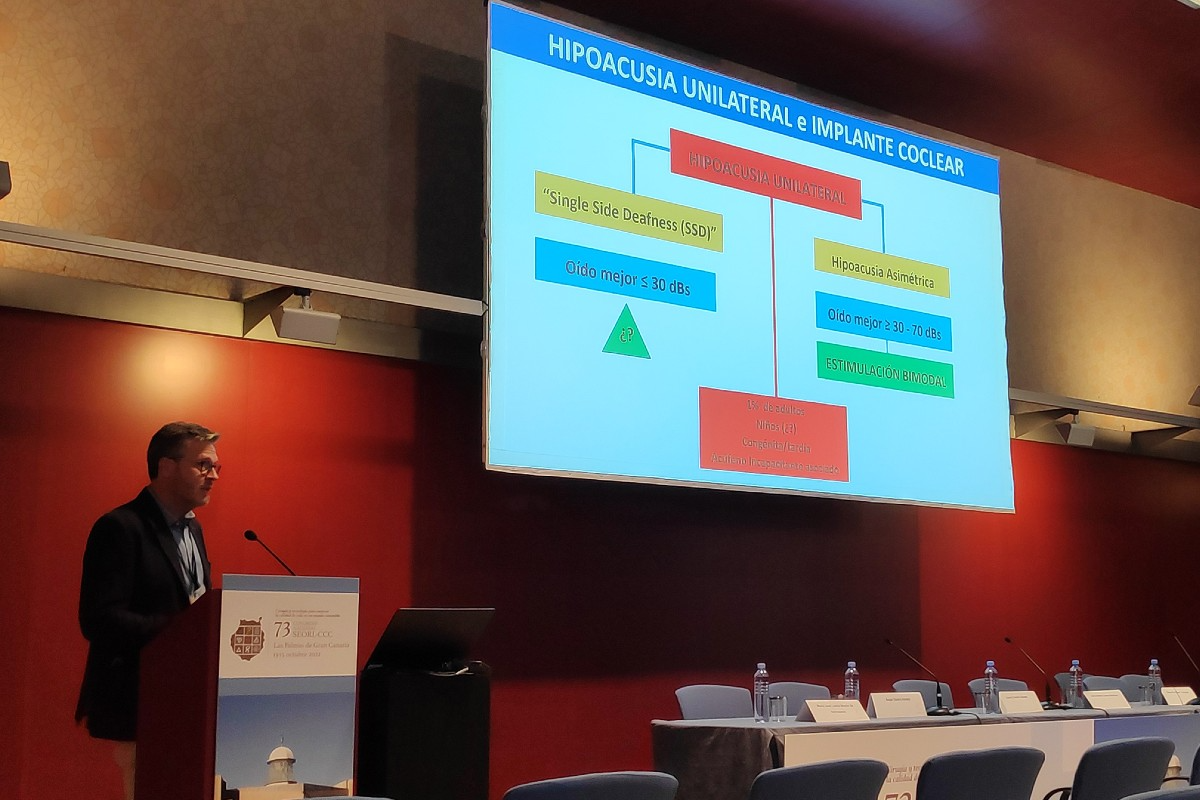 El doctor Ángel Osorio Acosta, Complejo Hospitalario Universitario Insular Materno Infantil, Las Palmas de Gran Canaria, protagonizó dos ponencias. La primera, `hipoacusia unilateral e implante coclear´, sirvió para conocer más detalles que permitan mejores decisiones clínicas basadas en evidencias sobre cómo manejar la Sordera Unilateral (SSD, por sus siglas en inglés) tanto en niños como en adultos.