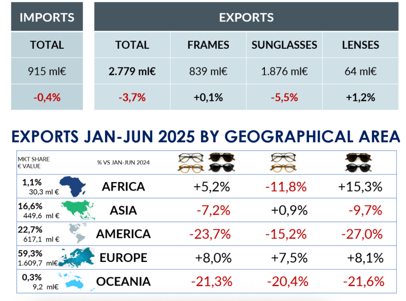 La primera mitad de 2025 cerró en un contexto global caracterizado por una alta inestabilidad económica y política. La industria italiana de gafas, que exporta alrededor del 90% de su producción, enfrenta desafíos significativos relacionados con los nuevos aranceles de importación introducidos por la administración Trump y la desaceleración de la demanda en algunos mercados clave. Al mismo tiempo, se observan señales alentadoras desde Europa y varios mercados emergentes que podrían abrir nuevas oportunidades de crecimiento.