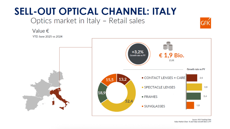 Según las cifras de POS Tracking de GfK-NIQ, en la primera mitad de 2025 el canal óptico italiano creció un +3,2% respecto al mismo período de 2024, alcanzando los 1.900 millones de euros. Es una señal positiva en un escenario de consumo interno aún frágil, pero que confirma la resiliencia del sector óptico.