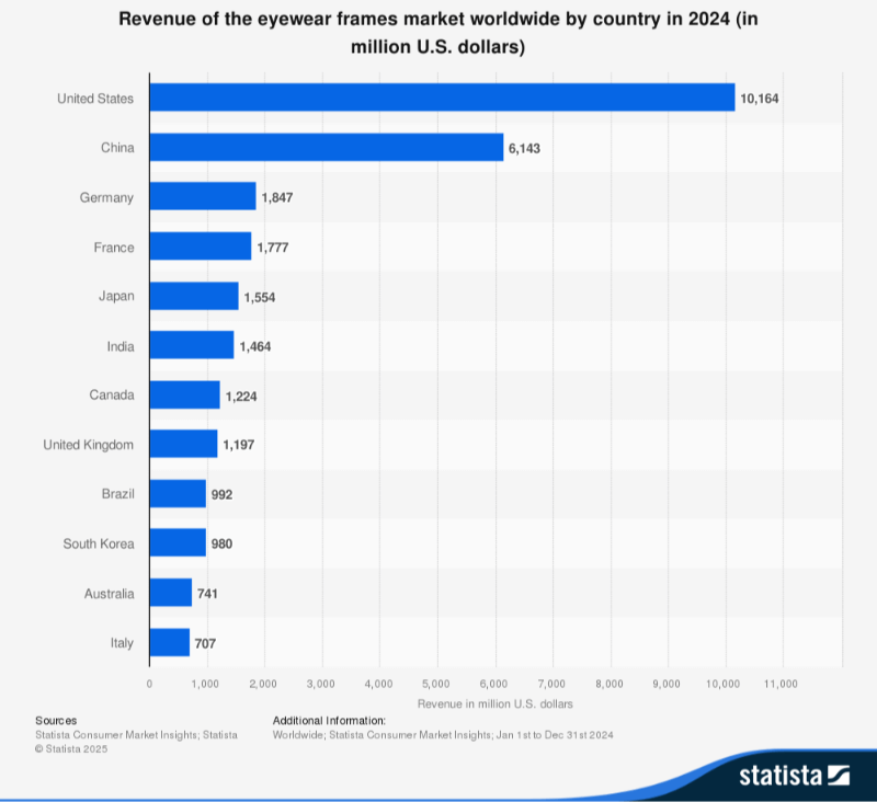 Los resultados económicos en la venta de monturas para gafas en España no son demasiado destacables. De hecho, en 2024 se calculaban un volumen de beneficios de 558 millones de dólares y no consigue entrar en el ranquin de los 12 países con más beneficios acumulados.